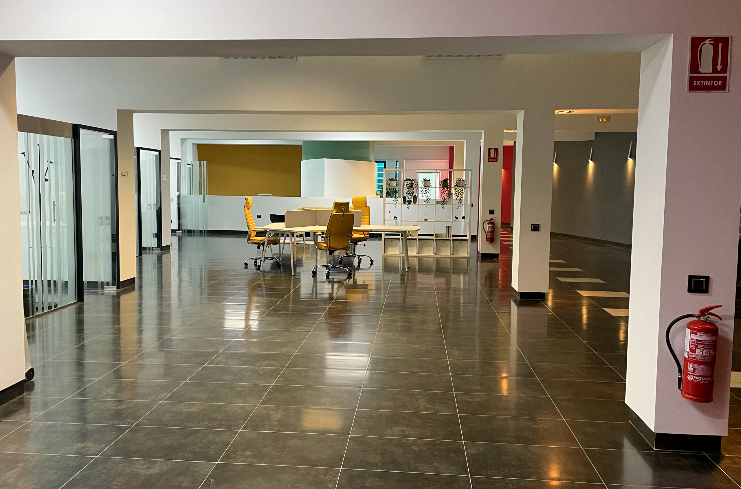 El uso del color, lejos de ser decorativo sin más, ha sido pensado para modular la energía del espacio. El amarillo estimula la creatividad y el pensamiento rápido; el fucsia aporta calidez e identidad vibrante; mientras que los grises y blancos equilibran y suavizan el conjunto, aportando profesionalismo y serenidad.