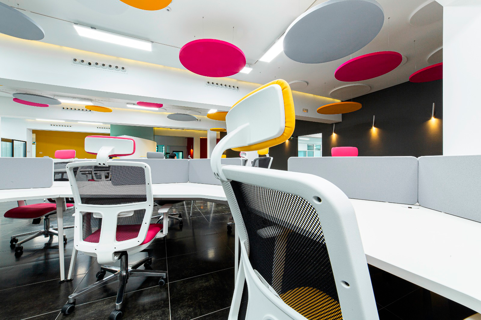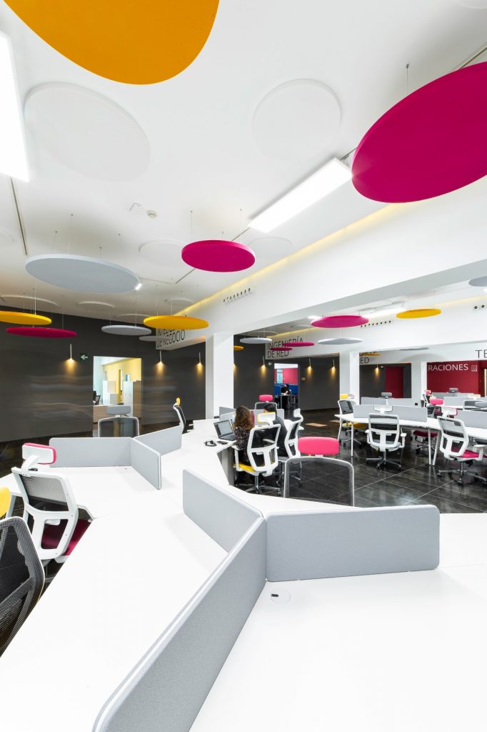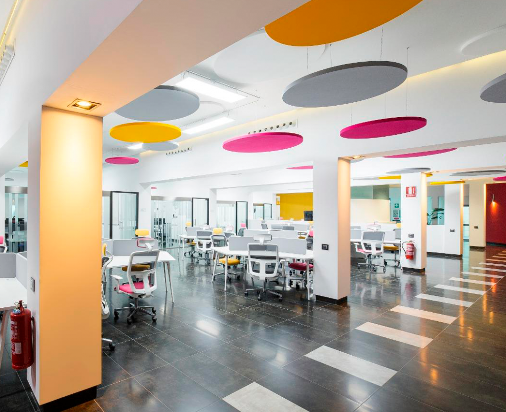 Un elemento clave del diseño es la incorporación de paneles fonoabsorbentes circulares suspendidos en el techo, en los mismos colores vibrantes que el mobiliario. Esta armonía cromática no es meramente estética: se trata de una estrategia sensorial bien calibrada. Los paneles cumplen una función acústica fundamental al absorber las ondas sonoras y reducir la reverberación del espacio, lo que crea un entorno mucho más silencioso y enfocado, incluso en áreas abiertas. Este tratamiento acústico mejora la concentración, disminuye el estrés auditivo y contribuye a una atmósfera de trabajo más placentera y eficaz.