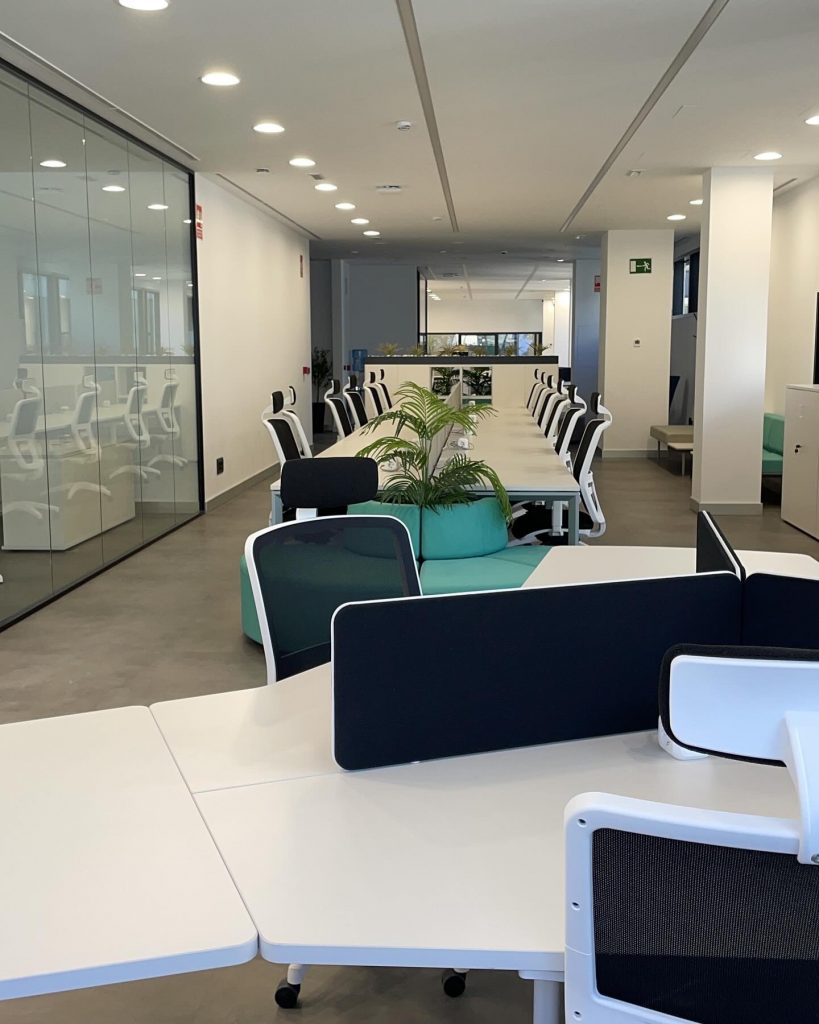 Este espacio de oficina ha sido diseñado pensando tanto en la funcionalidad como en el bienestar de las personas. La zona de trabajo abierta fomenta la colaboración y la comunicación fluida entre equipos, gracias a la disposición lineal y ergonómica de los puestos, con sillas de respaldo alto que favorecen una postura saludable durante la jornada laboral.