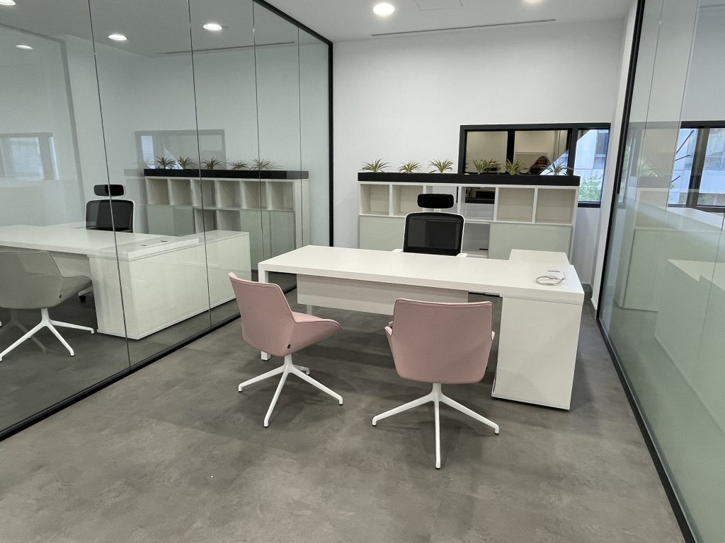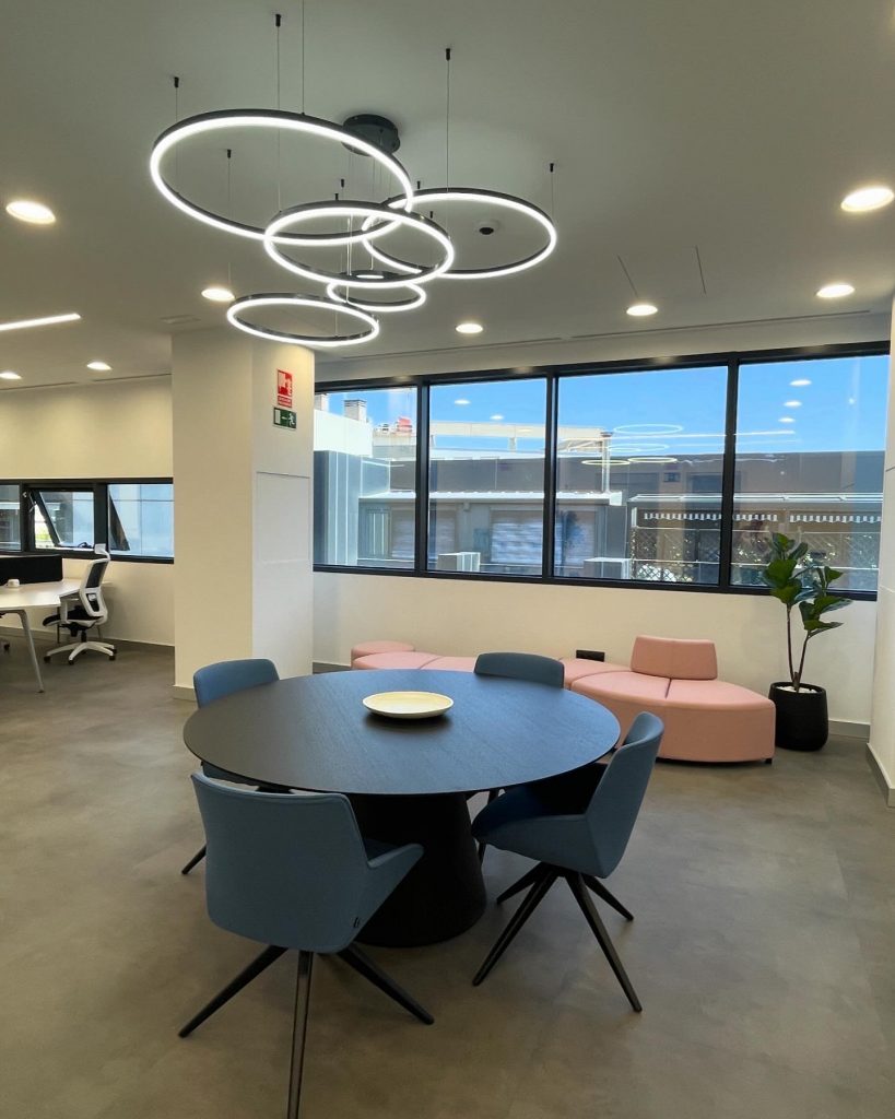 El área de descanso con mobiliario modular rosa claro crea un punto de desconexión informal y acogedor, mientras que la sala de reuniones incorpora tecnología de última generación y una estética moderna, perfecta para presentaciones estratégicas o sesiones creativas.