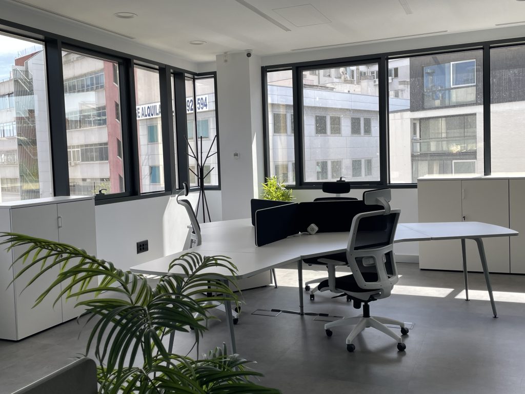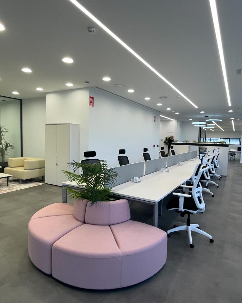 El mobiliario minimalista en tonos neutros, combinado con elementos naturales como las plantas, aporta una sensación de calma y equilibrio visual, lo que reduce el estrés y mejora la concentración. La iluminación natural abunda, especialmente en los puestos cercanos a los ventanales, y se complementa con luz artificial cuidadosamente distribuida para evitar reflejos y fatiga visual.